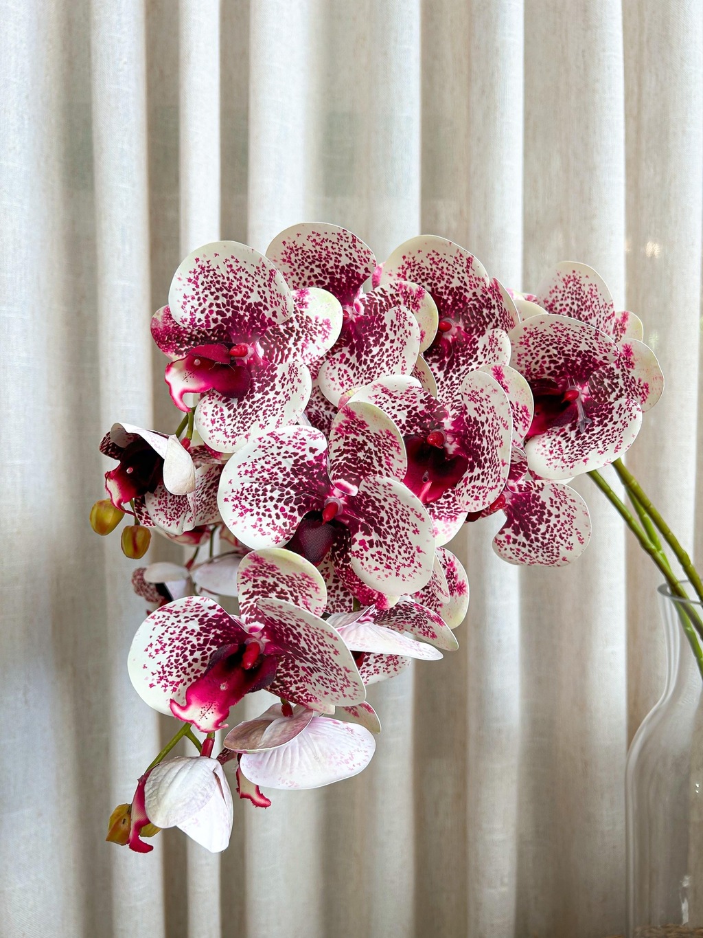 A Haste de Orquídea Dalila é uma peça encantadora que traz a delicadeza e o realismo das orquídeas naturais para sua decoração. Com pétalas brancas salpicadas em tons de vinho e detalhes vibrantes no miolo, essa haste permanente adiciona sofisticação e elegância a qualquer ambiente. Perfeita para composições florais ou para ser usada sozinha em vasos, ela mantém sua beleza impecável ao longo do tempo, sem necessidade de cuidados. Um toque de charme atemporal para seu lar!