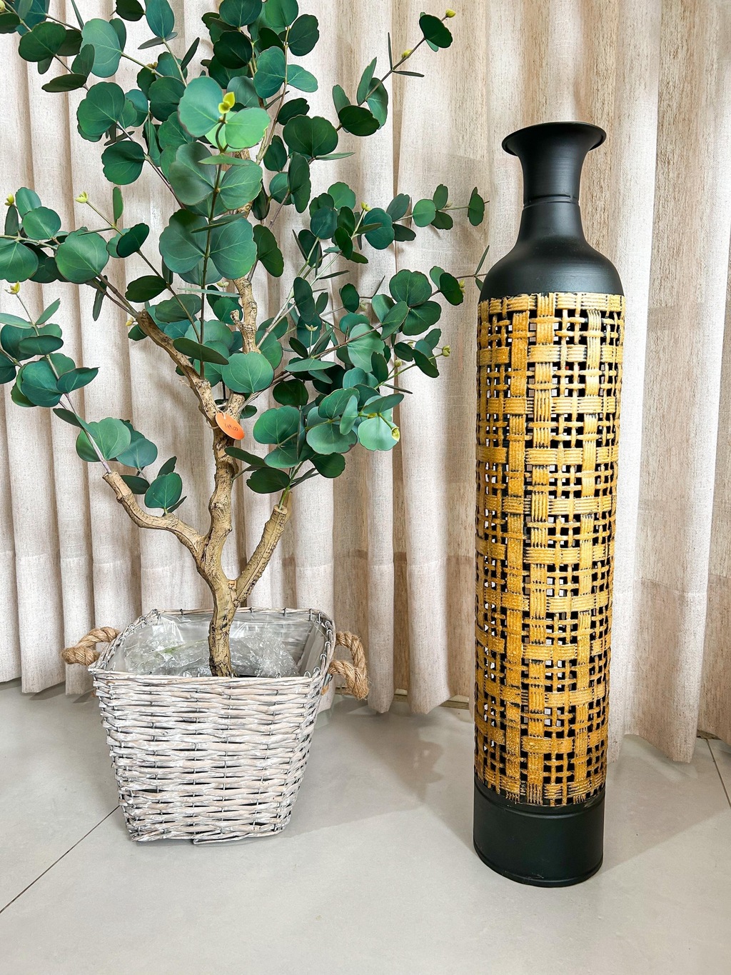 Feito inteiramente em metal, o Vaso Ébano Trançado traz um design imponente com seu corpo alto e detalhado em um belíssimo padrão vazado. Seu acabamento preto fosco confere sofisticação, enquanto o trançado em dourado envelhecido adiciona um toque de rusticidade refinada. Disponível em dois tamanhos, ele pode ser usado individualmente para um visual minimalista ou em dupla para uma composição impactante e elegante. Ideal para decorar halls de entrada, salas de estar e varandas, essa peça une resistência e estilo para transformar qualquer ambiente.